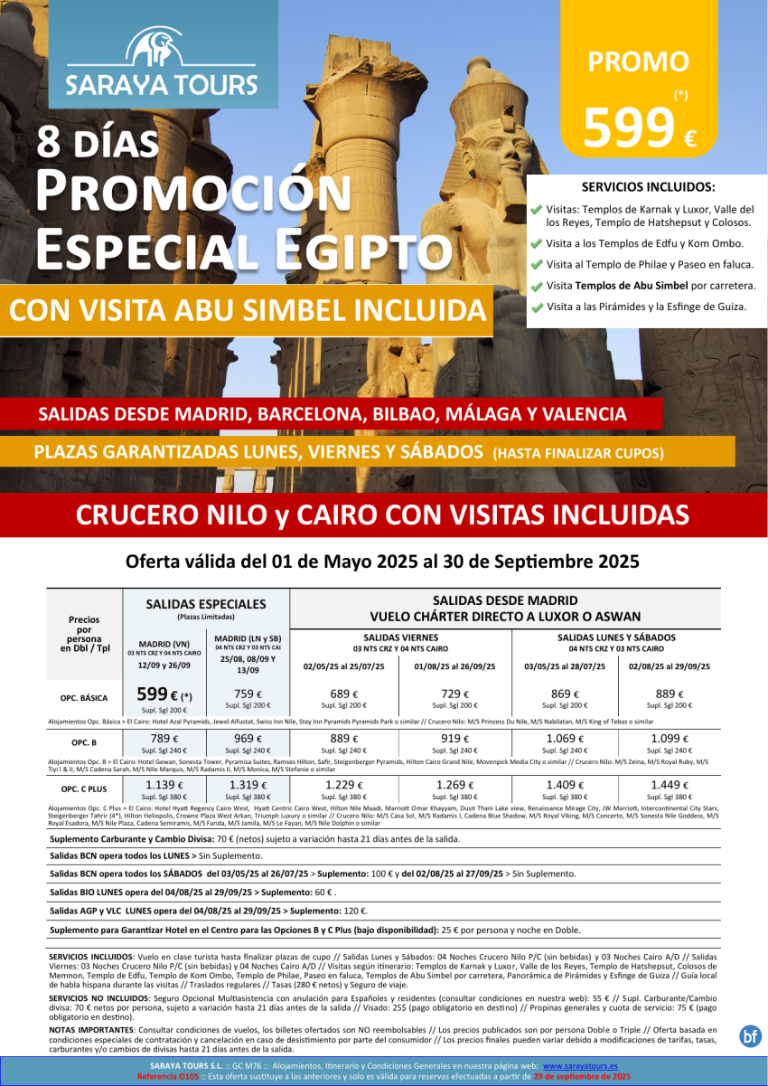 Promo Egipto con Abu Simbel 8días. *Salidas Mad, Bcn, Bio, Agp & Vlc* Crucero y Cairo desde 639 €