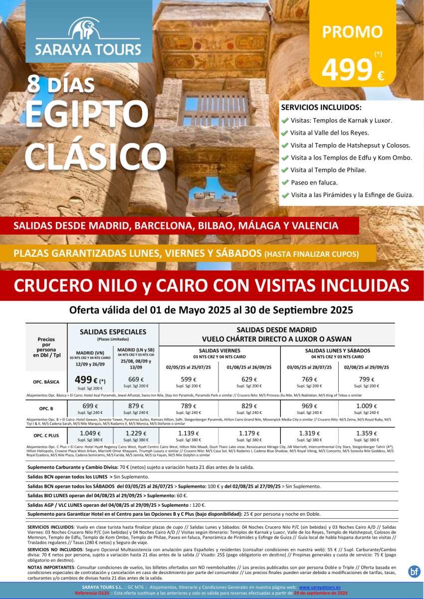 Egipto Clásico 8 días. *Salidas Bcn, Mad ,Agp ,Bio & Vlc * Crucero y Cairo + visitas dsd 539€ hasta Abril26