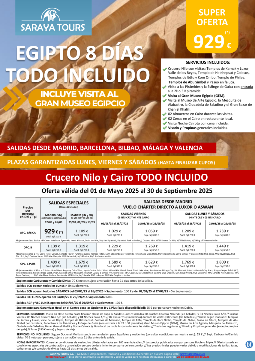 Egipto Todo Incluido 8d. *Salidas Mad,Bcn,Bio,Agp,Vlc* Crucero y Cairo+ visitas, Propinas y Visado. Desde 979€