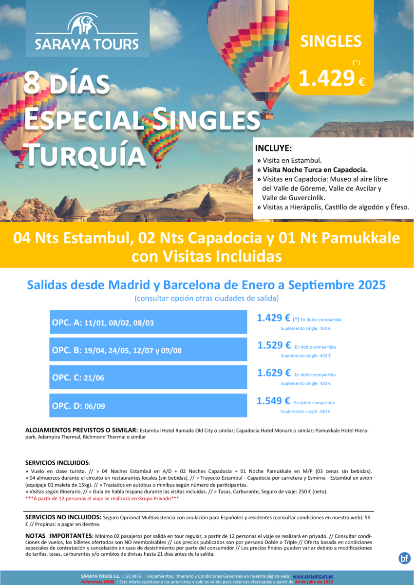 Especial Singles a Turquía 8d! Circuito Visitas Incluidas: Estambul, Capadocia, Pamukkale y más hasta Feb 26